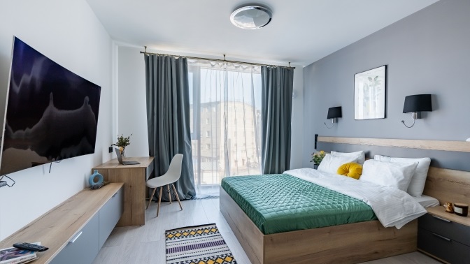 Аренда апартаментов «Sova Ярд View Blue» с кухней и видом на город для двоих: — Скидка 30% на аренду апартаментов «Sova Ярд View Blue» с кухней и видом на город в течение 1 суток (2 дня/1 ночь) для двоих (2660 руб. вместо 3800 руб.)